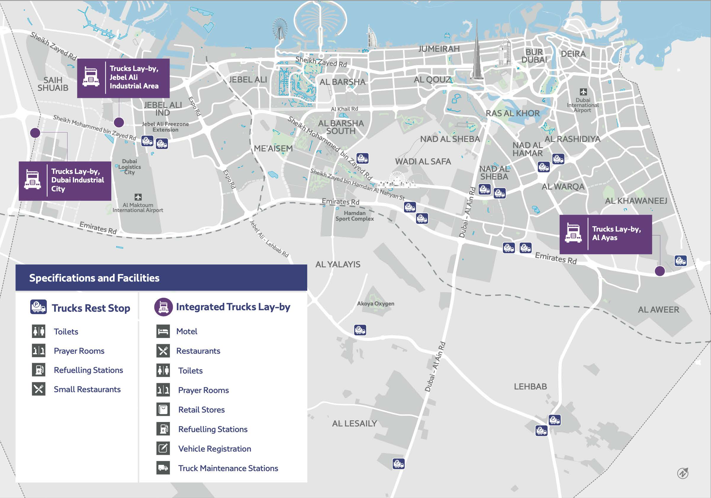تقوم هيئة الطرق والمواصلات في دبي (RTA) ببناء 19 محطة استراحة واستراحة للشاحنات عبر العديد من النقاط الساخنة في دبي بالشراكة مع القطاع الخاص. يتضمن المشروع 3 شاحنات متكاملة: واحدة بالشراكة مع شركة بترول أبوظبي الوطنية (أدنوك) ، واثنتان بالشراكة مع شركة المتملة لفحص المركبات وتسجيلها.