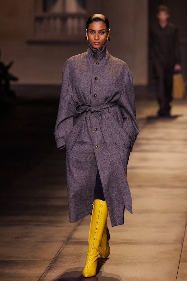 المعطف مشدود عند الخصر بحزام رمادي مطابق. (غيتي إيماجز)